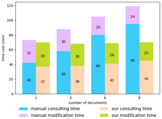 In order to verify the effectiveness of the proposed intelligent process design system, we invite five process personnel to participate in the simulation experiment. Each of them completes the assembly process, respectively, by manually consulting the documents and using our intelligent process design system. The total time cost is divided into consulting time and modification time, as presented in Figure 6. The consulting time includes the time for preparing the input process parameters and retrieving similar process instances. The modification time refers to the time taken to modify the process items to a reasonable process. As the number of assembly process documents grows, the intelligent process design system constructed in this work can retrieve similar process instances more efficiently. Meanwhile, the modification time of our system is the same as that of the traditional method, which reflects that the process design results suggested by our system can meet the requirements.