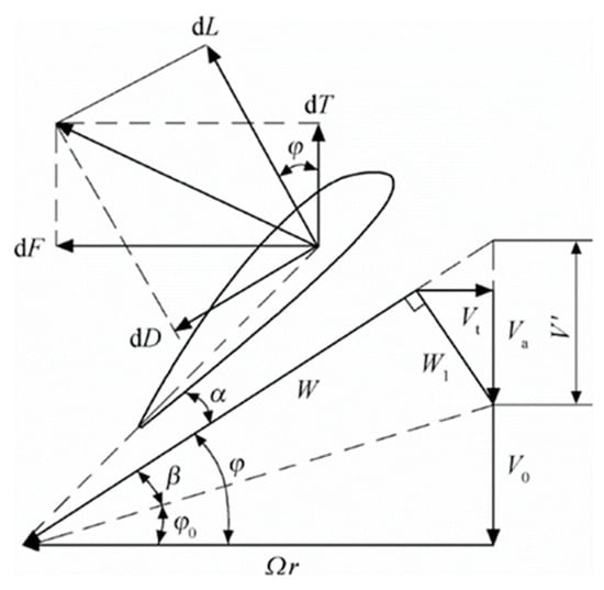 Among them, is the angle between the geometric composite velocity and the rotation plane, and is the lift coefficient of the blade element, is the drag lift angle of the element, and the calculation of the interference angle can be solved using Newton’s iterative method. can be obtained from the following equation: