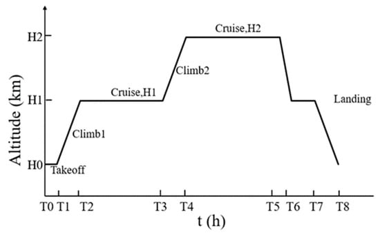 UAVs go through typical scenarios such as takeoff, climb, cruise, and landing within a flight mission profile. As shown in Figure 2, there are usually more than two cruise conditions at different altitudes for medium- and high-altitude UAVs.