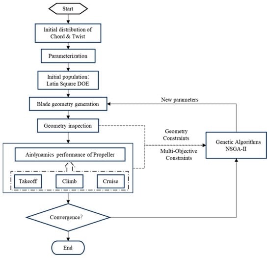 Based on the aforementioned mathematical model and the NSGA-II algorithm, a multi-objective optimization design of the propeller aerodynamic shape was completed. The flowchart is shown in Figure 3. The main optimization process is outlined as follows: