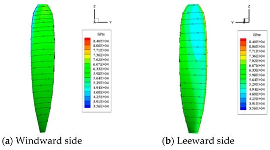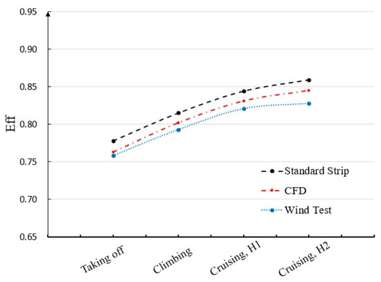 Table 1 presents the aerodynamic performance of the propeller under typical design conditions. Compared to the CFD simulation results, the results obtained from the standard strip analysis tend to be slightly larger. Taking the CFD simulation results as the benchmark, the error between the two methods is controlled within a 3% range. It can be considered that the rapid evaluation approach established in this paper can effectively reflect the aerodynamic performance of the propeller under various operating conditions, which is significant in reducing computational costs during the propeller design process. Both sets of computational results indicate that the designed propeller exhibits high aerodynamic efficiency under all usage scenarios, thus satisfying the operational requirements of the unmanned aerial vehicle platform.