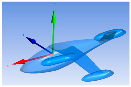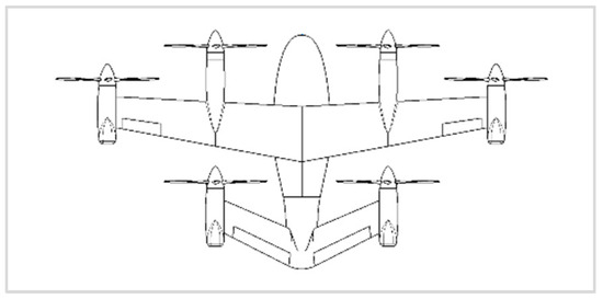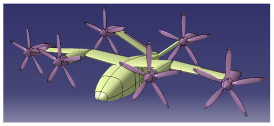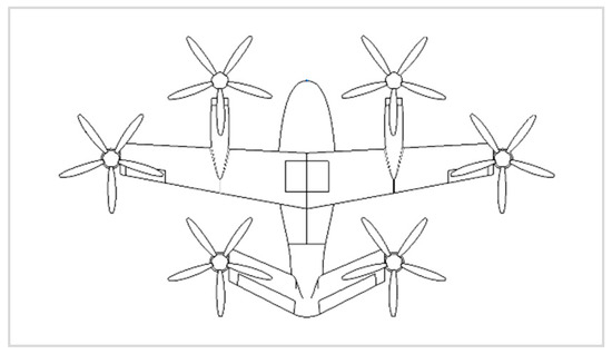 This paper is based on a 3000 kg hexa tiltrotor electric vertical takeoff and landing aircraft (abbreviated as H3.eVTOL). The H3.eVTOL has six tiltrotors, which are distributed in a hexagonal shape, with a V-tail, as shown in Figure 1.