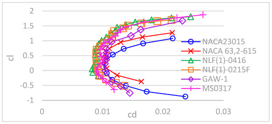 Part of the statistical results of the lift and drag characteristics of NACA 5-digit series airfoils, NACA 6-series airfoils, natural laminar flow series airfoils, and high lift series airfoils are shown in Figure 2, Figure 3, Figure 4 and Figure 5. The statistical results indicate that