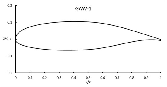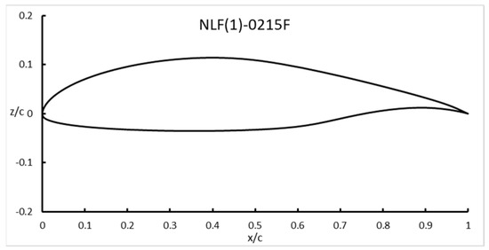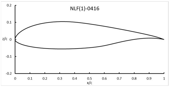 The lift and drag characteristics of NACA 23015, NACA 63,2-615, NLF (1)-0416, NLF (1)-0215F, MS (1)-0317, and GAW-1 airfoils are shown in Figure 6. As shown in Figure 6, GAW-1, MS(1)-0317, NLF(1)-0416, and NLF(1)-0215F airfoils have the highest maximum lift-to-drag ratio. Therefore, the airfoil of the wings can be further screened from the above four airfoils. The corresponding airfoil shapes are shown in Figure 7, Figure 8, Figure 9 and Figure 10.
