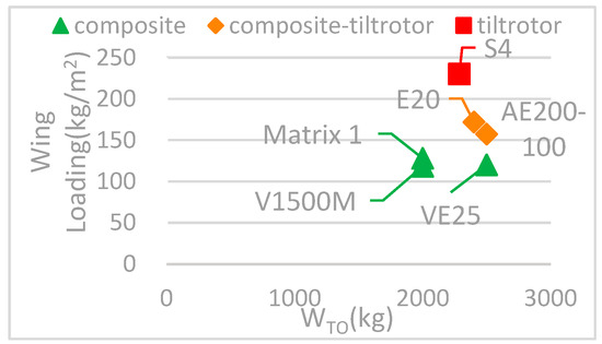 The initial value of the optimized design of the wing area in this paper is determined based on statistical values. The existing data on eVTOL wing loading are shown in Figure 11. Figure 11 indicates that the wing loading of the tiltrotor eVTOL is between 200 kg/m3 and 250 kg/m3. In this paper, the initial wing area is determined to be 13.3 m2 based on 225 kg/m3.