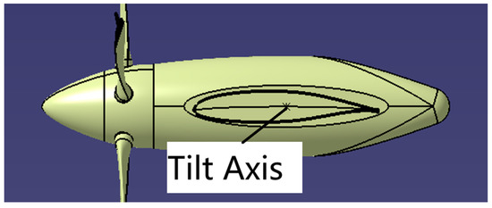 The center of gravity position of H3.eVTOL has not been determined yet. When determining the longitudinal position of the wing root, the X-coordinate of the leading edge of the wing root is preliminarily designed to be 1.99 m, so that the design of wing body fairing will be simpler in the modeling process. The position of the wing tip is mainly limited by the tip tilt mechanism, and the tip tilt axis is designed to coincide with the midpoint of the camber line of the wing tip profile, as shown in Figure 13.