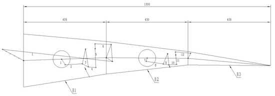 The variable bending rear edge is designed in three sections: B1, B2 and B3, among which the string length of B1 is 435 mm, the string length of B2 is 430 mm and the string length of B3 is 435 mm. The three variable modules are hinged together by cylindrical hinges. The outline of the rear edge and the initial position of the rod are shown in the Figure 1 below. The digital mark line in the figure is the two-stage linkage mechanism that has been designed to drive the variable bending trailing edge to achieve target deformation, and the circle part is the location of the driving device of the two-stage linkage mechanism.