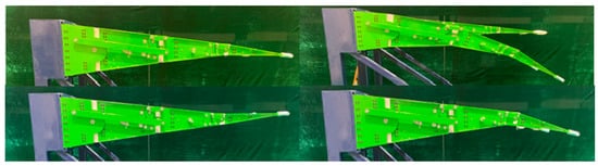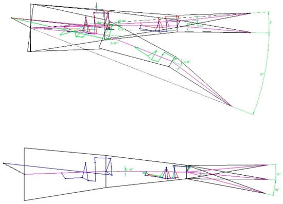 In the case of mode 1, the two-stage drive motor operates at the same time, driving the two-stage connecting rod mechanism to move, so that the overall deformation angle of the wing surface of the variable bending back edge is 5° up and 20° down. In the case of mode 2, the first-stage drive motor does not move, while the second-stage motor operates, so that the wing tip of the variable bending back edge is 10° up and 10° down. The deformation principle is shown in the following Figure 2.