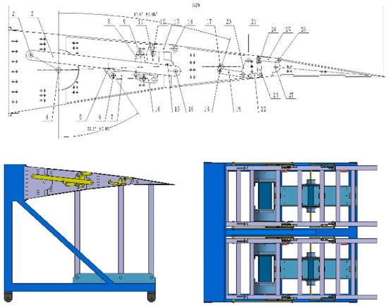 The variable camber trailing edge is used throughout the flight of the aircraft. In the process of takeoff and landing, the lift function takes place through the lower side of the trailing edge. During cruising, the smooth and continuously variable camber wing trailing edge plays various roles: (1) it deals with the aerodynamic efficiency caused by the change in aircraft weight; ② it slows down wind gusts; ③ it improves the aerodynamic characteristics of trans-supersonic flight; and ④ it reduces the radar reflection area [1]. A large number of studies have shown that the finger-type scheme of the wing trailing edge with variable curvature has the characteristics of a simple scheme, reliable stiffness and strength, and is suitable for large aircraft, and is currently a widely used scheme [2,3,4,5,6]. Although the finger-type scheme can only achieve segmental bending and drooping, it has been found through research that, usually, approximately three “knuckles” can meet the demand for airfoil bending from the aerodynamic perspective [7,8]. Based on this, a multi-mode bending wing trailing edge design scheme is proposed in this paper, and a control scheme for multi-mode deformation of a wing trailing edge is designed to realize multiple deformation modes. In addition, through rational material selection and power plant selection, the multi-mode variable bend wing trailing edge sample is manufactured, which verifies the feasibility of the design scheme in this paper.