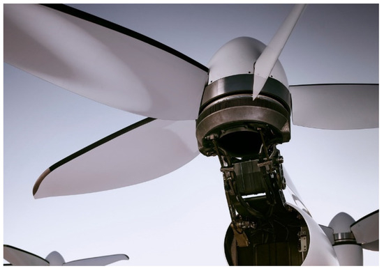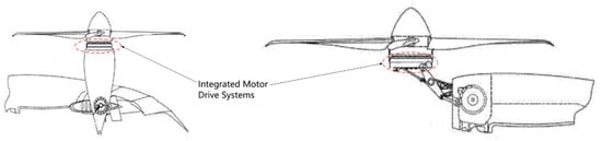 Joby adopts an integrated motor and controller design scheme, as shown in Figure 10, where the integrated motor drive system is mounted between the propeller and the nacelle [10]. When the tilting mechanism is located at the rear end of the nacelle, the electric propulsion system and the nacelle are tilted as a whole during the modal switching of takeoff, cruise, hovering, and landing, as shown in Figure 10, whereas the tilting mechanism is located at the front end of the nacelle, the position of the eVTOL remains unchanged when the eVTOL is in flight. When mode switching, only the propulsion system is tilted, and the position of the nacelle is fixed, as illustrated in Figure 10.