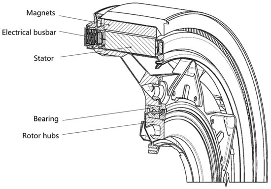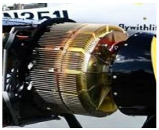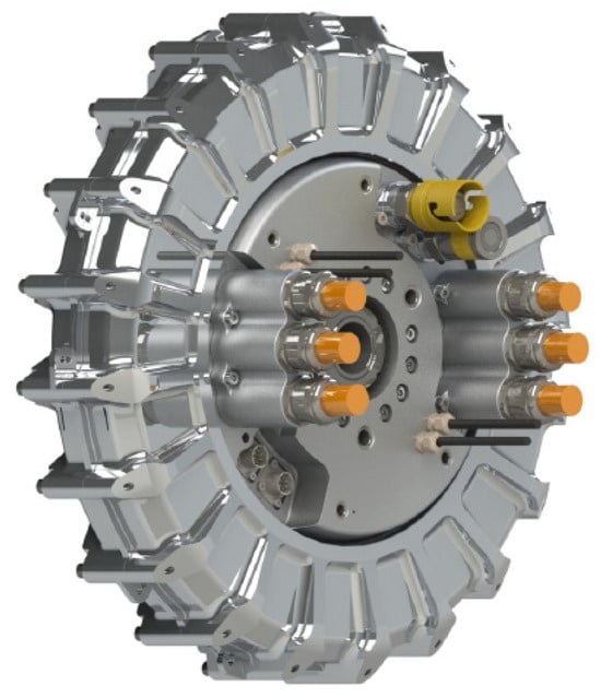 The electric propulsion motor developed by Magnix adopts a radial inner rotor scheme, as shown in Figure 16, and the end cover adopts a skeletonized design scheme, which reduces the weight of the motor, and the same sub-core integrates modular dual three-phase windings, which can be configured according to the needs of the winding phase shift angle, and it is easy to be dismantled and replaced when there are faults such as open circuits, short circuits to ground, short circuits between phases, short circuits between turns, and improves the maintainability [14].