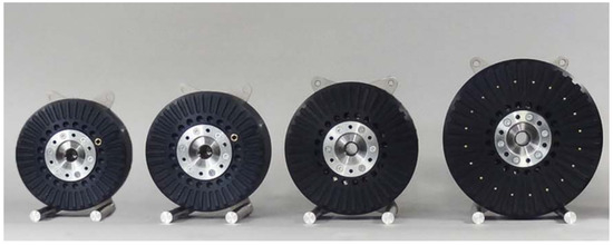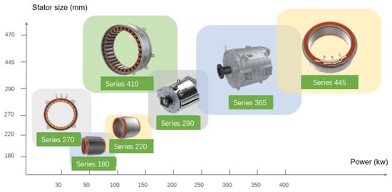Domestically, Tianjin SANTROLL Intelligent Equipment Co., Ltd. is committed to the research of various electric drive system technologies, and its main products are flat-wire motors and controller core components, with mature automated flat-wire motor production lines, and has successively developed flat-wire motors with stator sizes ranging from 180–445 mm and power ranging from 30–400 kW, as shown in Figure 8, which are widely used in electric load-carrying unmanned aerial vehicles and other fields [8].