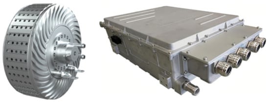 Shandong Jingchuang Magnetron Industrial Technology Research Institute Co., Ltd. owns the core technology of ‘’new high-efficiency and lightweight motor’’ and focuses on the R&D and innovation of electric aviation motors and system application solutions, including the customized development of aviation motor controller matching, aircraft propeller, thermal management system, and aviation connectors and wiring harnesses, and has formed a spectrum of motor products with rated power of 10–90 kW. Rated power 10–90 kW spectrum of motor products, the main performance parameters are shown in Table 6, the motor and controller photos are shown in Figure 9 [9].