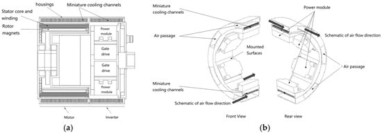 Schematic diagram of the integrated structure of miniature heat dissipation channel, motor, and controller, (a) 2D model, (b) Power module air-cooling 3D model.