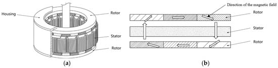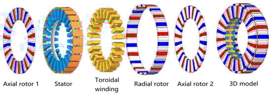 Literature adopts a combination of axial magnetic field and radial magnetic field [21], and on the basis of the existing dual-rotor, single-stator axial magnetic field motor, the radial outer rotor magnets are added to effectively utilize the coil edges of the radial outer side of the toroidal winding, as shown in Figure 28. When the motor works, the expression of electromagnetic torque is: