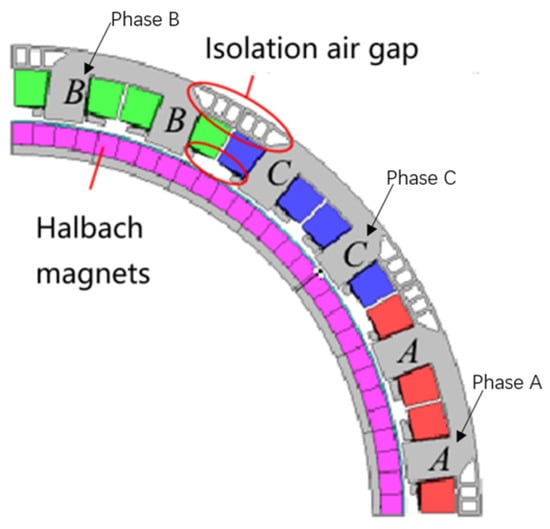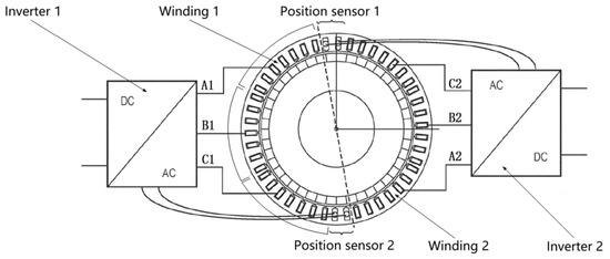 The electric propulsion system powers the eVTOL, which has high safety requirements, and under the aerodynamic redundant layout of the whole aircraft, the fault-tolerant performance is mostly further enhanced by the internal electrical redundancy of the motors. Safran has investigated a strong fault-tolerant propulsion system for all-electric or hybrid-electric vehicles, as shown in Figure 15. The propulsion motor stator adopts a modular dual three-phase topology, with dual position sensors integrated internally, and the windings and position sensors of each channel each occupy half of the mechanical circumference of the stator in order to realize the physical isolation between channels [13]. The three-phase windings in the same channel adopt a centralized winding structure, and the windings A1, B1, and C1 are mechanically phase-shifted by means of a pinion, which on the one hand ensures that the three-phase windings differ by an electrical angle of 120º, and on the other hand realizes the physical isolation between the three-phase windings in the channel.