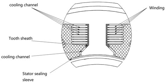Magnix’s single motor with a rated power of 280 kW adopts in-slot cooling technology, as shown in Figure 18. The winding in the slot is divided into multiple layers, and the winding supports are used between layers to realize the construction of the cooling runners. The winding supports are mostly made of polyether ether etherketone, and the entire stator section is cooled by oil, and the stator sealing sleeve is used to realize the physical isolation of the stator and rotor oil circuits, in addition to the design of cooling runners in the tooth section, which In addition, the cooling flow channel is designed in the tooth part, which further increases the coolant flow and realizes the stable operation of the motor with long-time liquid cooling.