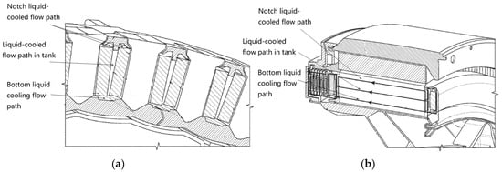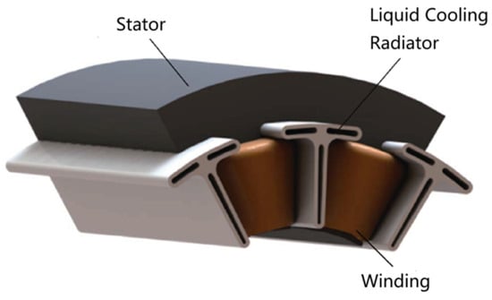 In addition, 3D printing can also realize the fabrication of the radiator, as shown in Figure 32, the liquid-cooled radiator is directly in contact with the stator core and stator windings, especially with the effective edge and end of the stator windings, and adopts the T-type structure, which is approximately equivalent to the formation of axial cooling flow paths in the grooves and the bottom of the grooves, which improves the power-to-weight ratio of the motor [27,28,29].