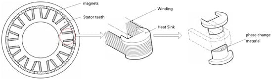 Safran invented a stator winding heat dissipation optimization structure based on phase change material, in which the winding ends are wound on a heat sink, which consists of two hollow parts nested together, and the hollow part is filled with liquid phase change material [16], as shown in Figure 21, which has the capability of absorbing the excess heat when the current density of the windings increases resulting in an increase in the winding heat generation, with a phase change temperature of 100–300 °C; the heat sink has a high thermal conductivity, reducing the thermal resistance between the winding and the heat sink, and between the heat sink and the phase change material. This technical solution effectively solves the heat dissipation of the winding end of the motor thermal island, making the winding end work within the permissible temperature rise of the enameled wire, and at the same time can realize the air cooling of the radiator through the outer rotor, greatly simplifying the cooling system and reducing the size and weight of the motor.