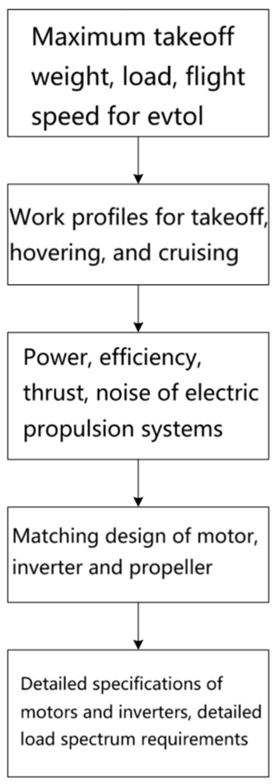 In order to realize the vertical integration of the key components of the electric propulsion system, improve product performance, integrated design first need to clarify the system working profile, tilt-rotor eVTOL as an example, the typical flight state including takeoff, lift tilt transition, climb, cruise, descent, deceleration tilt transition, landing, each flight state of the system power, torque, speed of the demand is different, and the various flight states due to different altitudes, resulting in different external environmental conditions, the system can be used in a variety of ways. The different flight statuses lead to different working conditions in the external environment, especially the air-cooling effect on the system when the propeller rotates. Therefore, in terms of application scenarios, the demand boundary is more complicated, and in order to simplify the analysis, the flight statuses can be classified into three types, takeoff, hovering, and cruising, among which the torque and power required in the takeoff and hovering phases are larger, and the motors are working in the short-term peak power output state, and the power demanded in the cruise phase is smallest, and the motors are working in the long-time peak power output state, and the power required in the cruise phase is small. The power is minimized in the cruise phase, and the motor works in the long-time rated power output state. The power and efficiency of the electric propulsion system are determined from the working profile, and the motor speed is reasonably selected according to the noise demand, which further completes the decomposition of the detailed performance indexes of the motor system, as shown in Figure 22.