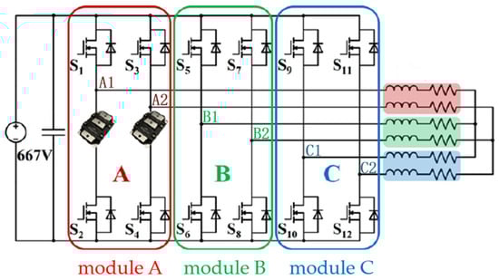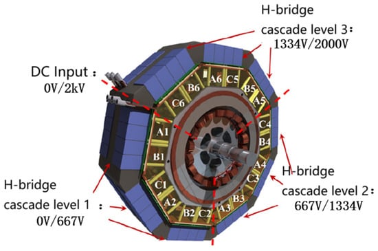 NASA predicts that the future electric aircraft propulsion power needs to reach 10–20 MW [17], and the maximum voltage will be increased to 20 kV AC (400–4000 Hz), in response to the increasing demand for electric propulsion power and voltage, the literature investigated a 2 kV, 1 MW integrated modular motor drive (IMMD) system, as shown in Figure 23 [18], where the motor stator adopts a ninesided design scheme to invert the 2 kV high-voltage DC by means of H-bridge three-stage series voltage divider, and the motor stator is divided into three physically isolated modules, each of which contains three-phase windings, three H-bridge inverters, and each phase of the windings contains two parallel branch circuits, with each H-bridge inverter supplying power to the two branch circuits of each phase of the windings, as shown in Figure 24. Within each individual module, dual windings and dual inverter channels are formed for mutual redundancy and improved reliability.