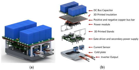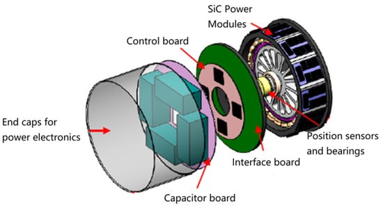 The structure of a single H-bridge inverter is shown in Figure 25 [19], which adopts a layered structure design to shorten the electrical alignment and reduce the influence of parasitic inductance. The two sets of bus capacitors, power modules, gate-level drives, and current sensors are placed symmetrically to improve inter-channel consistency, and the signals from the current sensors are sent to the main controller via fiber optics to reduce signal interference, and the cooling prismatic plate of the power module is close to the surface of the motor stator to strengthen the heat dissipation capability. The power-to-weight ratio of the whole inverter is expected to reach 35.36 kW/kg.
