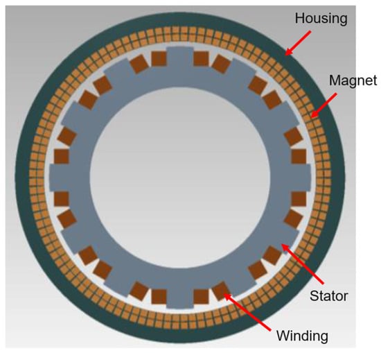 The main design parameters of the motor are shown in Table 7. Since the DC resistance is zero when superconducting coils are used, it produces a huge advantage in establishing a magnetic field, but it needs to operate at low temperatures, and the existing motors put the refrigeration equipment outside of the motor, which leads to changes in the structure, weight, and volume of the motor when it is mounted on the vehicle, while NASA’s motors have integrated chillers in the rotor, and connect the cold end of the chillers to the superconducting winding, and it is expected that the cooler The weight of the cooler is less than 10 kg, the diameter is less than 100 mm, and the rotational speed is up to 6800 rpm, which realizes the integrated and modular design of the superconducting motor. Due to the significant increase in the magnetic induction strength of the motor after the adoption of superconducting materials, the enameled wire is made of Leeds wire to reduce the eddy current loss of the winding. Meanwhile, in order to ensure the limitation of the output voltage, the stator winding is a single-turn coil, and for the requirement of stringent efficiency, 9-phase 12-pole structure is adopted to reduce the harmonic content. The motor stator, relative to the superconducting rotor, plays the effect of a vacuum shell to thermally isolate the surrounding air from the rotor, assisting in the realization of the low-temperature operating environment requirements of superconducting materials, the stator is designed with a liquid-cooling circuit and a manifold structure to achieve highly efficient heat dissipation of the stator windings. By limiting the linear velocity on the rotor surface of the motor, the risk of stress on the rotor coil based on composite superconducting materials is reduced.