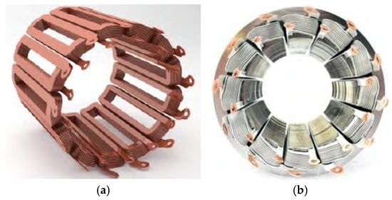 Flat wire hairpin (harpin) technology, the use of continuous wave winding process, as shown in Figure 33, can effectively reduce the solder joints, much attention in the field of high-power electric propulsion. Compared with round copper wire, it can increase the slot fullness by more than 30%, which reduces the DC copper loss of the motor and improves the efficiency, but when the motor works at high frequency, the AC copper loss of the flat wire will increase significantly, at this time, it is necessary to use multi-stranded flat wires and multi-layer placement to reduce the AC loss [30,31].