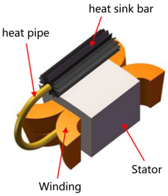 Compared with the cruise condition, the overload power of electric propulsion motor in take-off condition is at least twice as much as that in cruise condition. In order to improve the power-to-weight ratio of the whole aircraft, the thermal design of short-term overload in take-off condition must be considered, and at this time, the temperature rise of the motor is not only affected by the cooling method and structure, but also affected by the heat capacity to a large extent. Phase change materials have large latent heat and can absorb more heat under the same temperature rise when phase change occurs, so the heat capacity of the motor can be significantly increased, which makes it an efficient cooling medium for high thermal load electric propulsion. Literature inserted a heat pipe formed by encapsulation of liquid gas phase change material in the middle of the slot winding and casing of an aero-electric propulsion motor, as shown in Figure 34, and the experimental results show that the heat pipe technology reduces the thermal resistance between the heat source and the casing, and the electrical load of the motor can be increased by 35%, and the heat dissipation of the motor is significantly enhanced [32].