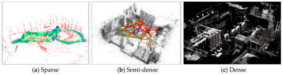 Non-textured environments such as white walls, spaces, and long tunnels seriously affect the performance of feature-based visual SLAM algorithms. Direct SLAM techniques are typically employed in these settings and can be categorized into the following three distinct types: dense, semi-dense, and sparse. As illustrated in Figure 1, DTAM [6] employs a keyframe-based approach to generate a detailed depth map by minimizing overall photometric discrepancies. A keyframe-based framework is also employed in [7] to build dense maps and track RGB-D cameras by minimizing photometric (intensity) and geometric (depth) errors. The literature [8] proposes a semi-dense monocular visual sounding method, which models the inverse depth of each pixel using a Gaussian probability distribution, and this model is carried over from one frame to the next, particularly focusing on areas with significant changes in brightness. LSD-SLAM [9] completes the ranging algorithm of the SLAM algorithm by maintaining a global map containing keyframe pose maps and related probability semi-dense depth maps, which reduces the cumulative drift and scale drift in terms of larger-scale estimation. SVO [10] employs a semi-direct method for monitoring camera movement and initially gauges the camera’s position by aligning sparse image models thus reducing the brightness discrepancy between corresponding pixels. Then, the reprojection error is minimized by feature alignment to achieve attitude and structural joint optimization. The former approach has been significantly expanded [11] to accommodate various camera setups, edge detection, and additional camera types by implementing comprehensive photometric adjustments, such as exposure duration, lens shading, and non-linear response curves. DSO [12] introduces a sparse and direct visual odometry method, demonstrating superior results compared to dense or direct techniques. A new formula for modeling photometric parameters minimizes photometric errors and collectively optimizes camera attitude, affine brightness parameters, inverse depth values, and camera inherent characteristics.