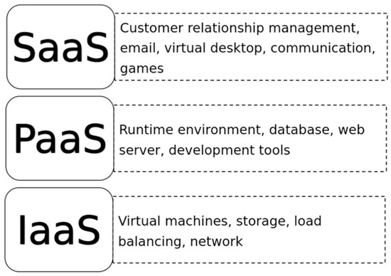 Due to the limited energy and carrying capacity of UAVs, modules such as visual perception usually require a large amount of calculation when conducting performance optimization and online perception verification, which will undoubtedly affect the endurance of UAVs themselves. In view of this, when optimizing and verifying the deployment of the visual perception algorithm, the work of online verification and deployment should be moved to the edge for decentralized processing, and the performance optimization should be moved to the cloud for centralized calculation [86]. With the unique resource service mode of cloud computing, resources needed in the resource pool can be conveniently shared anywhere at any time [44]. The traditional cloud computing framework is categorized into IaaS (Infrastructure as a Service), PaaS (Platform as a Service), SaaS (Software as a Service), and another variant of PaaS (Platform as a Service) (Figure 4).