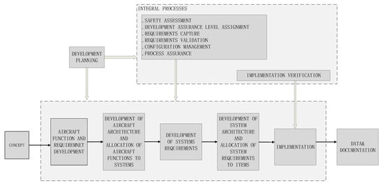 Commercial aircraft avionics systems now typically include flight management systems, modular integrated processing systems, integrated display systems, communication systems, navigation systems, air traffic control systems, air data systems, information systems, cabin systems, engine indication and cockpit warning systems, traffic collision avoidance systems, ground proximity warning systems, and data recording systems [8]. Avionics systems cover a very wide range of aircraft functions and basically cover the main electronic systems on the aircraft; therefore, avionics systems perform most of the core functions of aircraft control, such as communication, navigation, display, alarm, and so on. The development of an avionics system based on these functions generally follows the civil aircraft development process of ARINC ARP 4754A to carry out system design (see Figure 1) [9]. System design requirements are the basis of system development but also the key to system design, which should be focused on.
