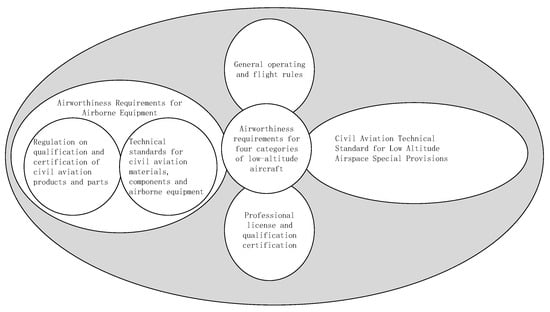 The existing system of general aviation low-altitude operation regulations and standards mainly includes three parts: first, low-altitude airspace air traffic management; second, low-altitude operation management; third, low-altitude service guarantee management [7]. Based on the basic requirements of general aviation low-altitude operation, low-altitude flight aircraft must meet the corresponding four types of airworthiness requirements. First, the general rules of operation and flight. Second, the airworthiness requirements of airborne equipment required for low-altitude flight, civil aviation products and parts certification provisions, and civil aviation materials, parts, and airborne equipment technical standards provisions. The third is the special regulations for civil aviation technical standards in low-altitude airspace, and the fourth is the revision and improvement of the training outline for the main professional technical qualified personnel such as flight, maintenance, air traffic control, and safety supervision in terms of professional license and qualification approval [12]; see Figure 2. In this paper, according to the design characteristics of avionics systems in low-altitude aircraft, the relevant airworthiness requirements of avionics system design are put forward.