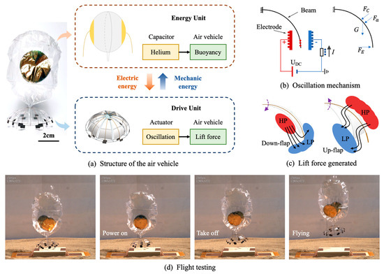 In this paper, we propose a micro-vehicle configuration with a 5 cm wingspan, as shown in Figure 1a, which consists of two parts: an energy unit and a drive unit. The energy unit is fabricated into structural capacitance through the gold coating process, which can provide buoyancy for the micro-vehicle as well as the energy output for the drive unit. The drive unit is designed based on the electrostatic drive principle, whose low power consumption meets the capacitor’s electrical energy output requirements. The beam of the drive unit is designed as a curved configuration, as shown in Figure 1b. Under the action of a high-voltage DC electric field, the electrostatic force FE overcomes the mechanical force Fc and aerodynamic force Fa to oscillate between the electrodes. As shown in Figure 1c, while flapping down, the wing films have a larger aerodynamic cross-sectional area to generate a lift airflow. While flapping up, the airflow makes the wing films rotate, and the aerodynamic cross-sectional area decreases to reduce aerodynamic resistance. The wing films rotating during flapping will result in changes in position of the low-pressure (LP) and high-pressure (HP) regions, generating aerodynamic lift, which is similar to the flapping wings of some insects or birds [34,35,36,37,38]. The aerodynamic forces are generated by a single beam in the vertical direction during flight motion, as shown in Figure 1d. The designed microvehicle has a total mass of 165 mg, a height of 105 mm, a flapping wingspan of 50 mm, and it is powered by an onboard capacitor to achieve untethered flight for more than 60 s.