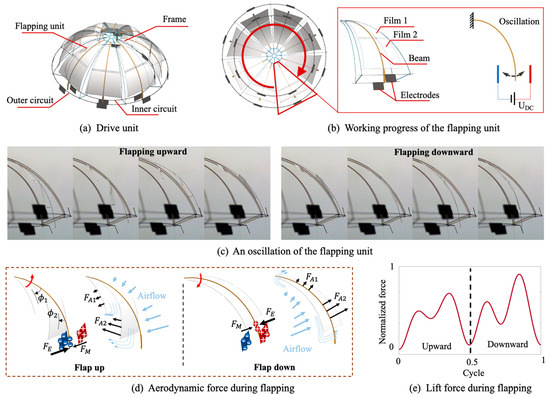 The curved drive unit was inspired by the swimming bell of jellyfish in nature. When the bell contracts, a high-pressure zone is generated inside the cavity, and water is ejected downwards to produce propulsion. When the bell expands, a high-pressure zone forms in the outer cavity, and water gradually fills up the inner cavity. The contraction and expansion phases of jellyfish present asymmetric performance, which makes the contraction faster and thus produces more thrust. While in the contraction process, the cavity deforms slowly. Therefore, airflow will produce a light driving effect. Based on the curved configuration of the jellyfish swimming bell, a curved drive unit was designed. As shown in Figure 2a, the structural components of the propulsion unit include the flapping units, the frame structure, the inner circuit ring, and the outer circuit ring. Among these components, eight beat units are symmetrically distributed in the circumferential direction, and the structure of a single beat unit consists of a metal beam and two wing membranes as well as a pair of electrode plates on the inner and outer circuit rings, as shown in Figure 2b. When a high-voltage DC signal (UDC) is applied to the inner or outer circuit ring, the flapping unit undergoes self-excited vibration between the electrodes, generating a propulsive driving force in the vertical direction.