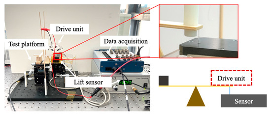 In this section, the thrust force in the vertical direction of the flapping unit is tested using a microforce measurement sensor (Force Transducer Series 400B, Aurora, ON, Canada) and postprocessing software (National Instrument DAQ Express 5.1, Austin, TX, USA). The test platform is shown in Figure 3, including the drive unit, data acquisition, lift sensor, and test platform, in which the drive unit output the thrust force to the sensor through a lever and the test platform and lift sensor were connected to the ground to avoid damage due to electrical breakdowns caused by accidental high-voltage short connections. After the test, data acquisition and post-processing were carried out to obtain the thrust values (shown in Figure 4 and listed in Table 1) with the increase in the number of flapping unit and the lift force’s approximate linear increase.