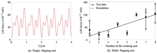 - Adopting multiple flapping units gave the driving unit the ability to work stably. The thrust generated by a single flapping unit in one cycle was 0.032 mN, and that generated by multiple flapping units was 0.127 mN, while the mass of the whole drive unit was 105 mg with a thrust-to-weight ratio of 0.123.