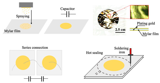 In structural capacitor design processing, a 0.004 mm polypropylene film was used as the substrate, and the film capacitor was formed by spraying gold on both sides with spraying equipment (SC7620 Sputtering Coater, Origin or Brand: Quorum Technologies Ltd., Lewes, UK), as shown in Figure 5. The thickness of the sprayed gold could be calculated with Equation (1), where d is the coating thickness; K is a constant determined by the test (K = 0.17 in the test); I is the plasma current; U is the applied voltage; and T is the spraying time. In the test, gold was sprayed in an argon environment with a plasma current of 18 mA and a voltage of 1000 V for 300 s. The sprayed thickness of the film capacitor was measured to be 91.8 nm, and the resistance of the surface was less than 4 Ω: