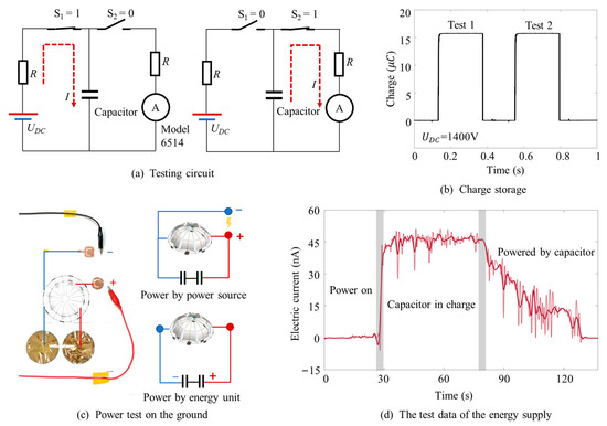 In the endurance test, the working voltage was at the kV level, but the current was at the 10−9 A level, and the total power consumption was at the 10−4 W level, which are low enough to make the capacitor energy supply reasonable and feasible. In the test, the power consumption of the drive unit was tested under the condition of a structural capacitor energy supply, and the capacitor energy supply test is shown in Figure 6c. Firstly, the capacitor and drive unit were connected in parallel to the power source, and when powered on, the capacitor would be charged. After disconnecting the power source, the energy input of the drive unit would be independently supplied by the capacitor.