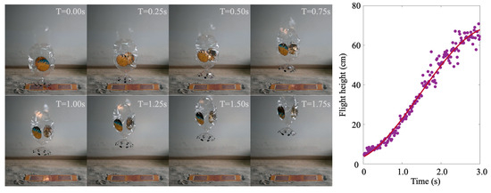 The flying trajectory of the vehicle was captured in the software Tracker. The tracer point position of the moving trajectory is shown in Figure 7, where the plum-coloured line is the micro-vehicle tracer. It can be seen that the micro-vehicle could achieve untethered flight when powered by the onboard capacitor. In the future, the novel type of energy supply will be further explored to achieve long flight times.