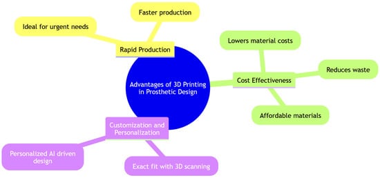 The application of 3D printing in prosthetic designs has introduced significant advancements, redefining how prosthetic devices are manufactured, customized, and delivered. This transformative technology addresses several traditional challenges, providing unparalleled benefits in terms of speed, cost, and customization, as shown in Figure 2. In this section, its primary advantages were discussed below.