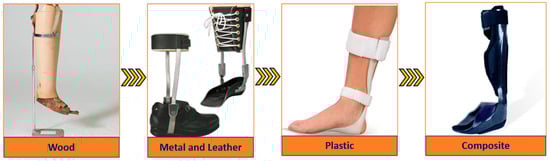 The evolution of materials used in prosthetics (Figure 4), showcasing a transition from traditional materials to advanced 3D-printed options. Initially, wood was used for prosthetic limbs, providing basic functionality but with limited comfort and flexibility. Over time, metal and leather became more common, offering enhanced durability and support. The next phase saw the introduction of plastic, which provided greater customization, lighter weight, and more comfort for users. The use of composite materials represents the latest advancement, combining strength, flexibility, and lightweight characteristics, often achieved through 3D printing for more personalized and efficient prosthetic designs. Early prosthetics were constructed from wood and metal due to their availability and basic structural properties [31]. The introduction of synthetic polymers in the 1900s, such as silicone, polyurethane, and thermoplastic gels, greatly enhanced the realism, comfort, and functionality of prosthetics [32]. Over the last 40 years, the use of composite materials, which are lightweight and structurally resistant, has become increasingly prevalent, particularly in dynamic prosthetic components, like feet and knee joints [33,34]. In modern prosthetics, metals like titanium and cobalt-chrome alloys are commonly used for their strength, corrosion resistance, and biocompatibility [35,36]. Advanced polymers, such as polypropylene and polyethylene, are valued for their fatigue resistance, ease of shaping, and ability to mimic natural tissue properties [37]. Ceramics and composite materials are particularly important in dental prosthetics due to their durability and aesthetic qualities. Recent developments in biomimetics have enabled the creation of prosthetics that closely replicate biological appendages, enhancing both functionality and user comfort [38]. The early applications of 3D printing in prosthetics were focused on rapid prototyping, offering the ability to create patient-specific devices using medical imaging, which facilitated better fit and comfort [24,39,40]. Initially relying on basic polymers, 3D printing in prosthetics has evolved to include high-performance metals, ceramics, and bio-resins, improving mechanical properties, durability, and biocompatibility [41,42,43,44]. Hybrid materials, such as combinations of polylactic acid (PLA) with bio-resins, have been developed to strengthen prosthetic structures while improving user comfort. Additionally, tactile sensing materials, like polydimethylsiloxane (PDMS), have been utilized to enhance the haptic experience [45,46]. The materials and technologies used in prosthetics have evolved from basic wood and metal to advanced composites, polymers, and metals, significantly improving the functionality, customization, and accessibility of prosthetic devices [31,38,47,48].