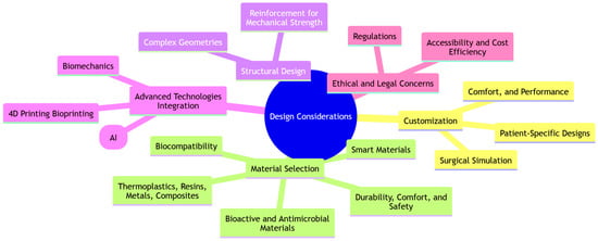3D printing technology has revolutionized the design and manufacturing of prosthetic and orthopedic devices, offering numerous advantages, such as customization, reduced production costs, and the possibility of integrating advanced technologies. These benefits have led to the adoption of 3D-printed prosthetics and orthotics in clinical settings, but several key design considerations (Figure 5) must be addressed for optimal outcomes.