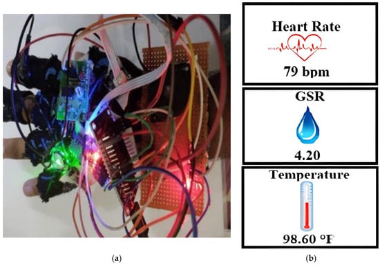 Figure 2. (a) Image of system equipped with sensors, (b) image of data displayed in real-time over local host interface. - Local host interface: The collected sensor data are displayed in real-time on an intuitive local host interface (refer to Figure 2b), allowing healthcare professionals and caregivers to monitor stress levels effectively. This interface also facilitates the manual recording of data in an Excel spreadsheet to ensure data completeness, accuracy, and analysis.