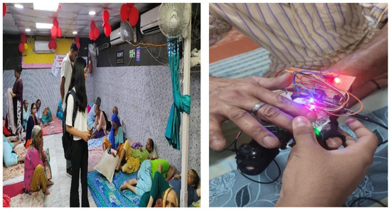 Data were collected from SHEOWS (Saint Hardyal Educational and Orphans’ Welfare Society), residents of an old age home, New Delhi (refer to Figure 3). Sensors were used to measure physiological parameters (Heart Rate, Galvanic Skin Response—GSR, and Skin Temperature) which are relevant to stress detection. These parameters served as input features for the stress classification system.