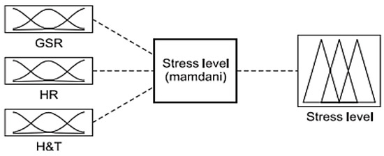 The Fuzzy Inference System (FIS), as shown in Figure 4, was developed and used to classify the stress levels based on the input signals received from GSR, HR (Heart Rate), and H &T (Body Temperature). This is same as was used in [30]. In this work, the Mamdani FIS algorithm was used since it offers various advantages over Sugeno FIS, including suitability for complex decision-making [30]. Another justification for using Mandami FIS is its usage in the previous study on which this work is based [30].