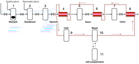 In addition to the flow in the outer cylinders of the hollow fiber reactors of the jejunum, ileum, and colon, the blood enters and leaves a well-stirred compartment representing the vascular circulation. The latter communicates with a cellular compartment (extravascular circulation) and the liver (responsible for the first-pass effect [16]), both modeled as CSTRs, as described in Equations (7)–(9):