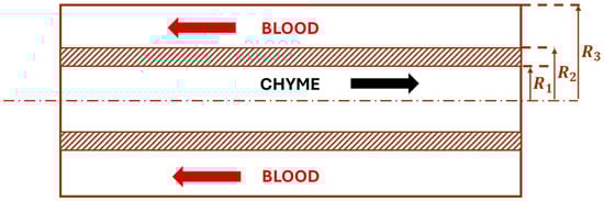 The jejunum, ileum, and colon are modeled as a series of a well-stirred compartment and a hollow fiber reactor. The latter is formed by two concentric cylinders: the inner one represents the intestinal lumen, in which the chyme moves, whereas the blood flows in the outer cylinder, in the opposite direction, as schematically depicted in Figure 2. This representation of the intestine introduces a spatiotemporal dependence for the drug concentration, as illustrated in Equations (5) and (6):