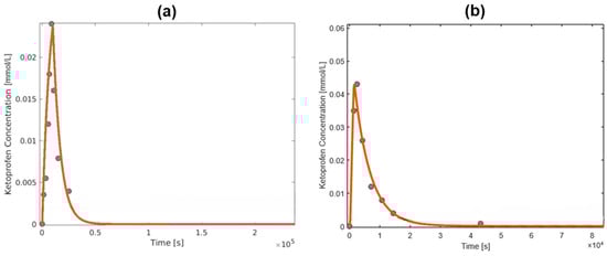 Ketoprofen blood concentration profiles over time with (a) or without (b) food. The red line corresponds to the model output, while the gray dots are the experimental data available from the literature [17].