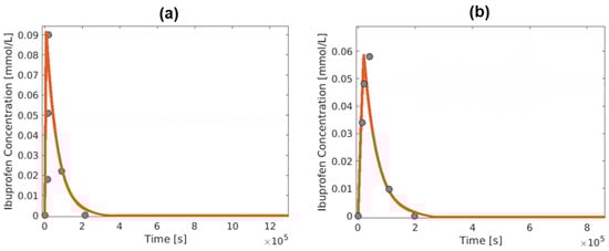 Ibuprofen blood concentration profiles over time with (a) or without (b) food. The red line corresponds to the model output, while the gray dots are the experimental data available from the literature [18].